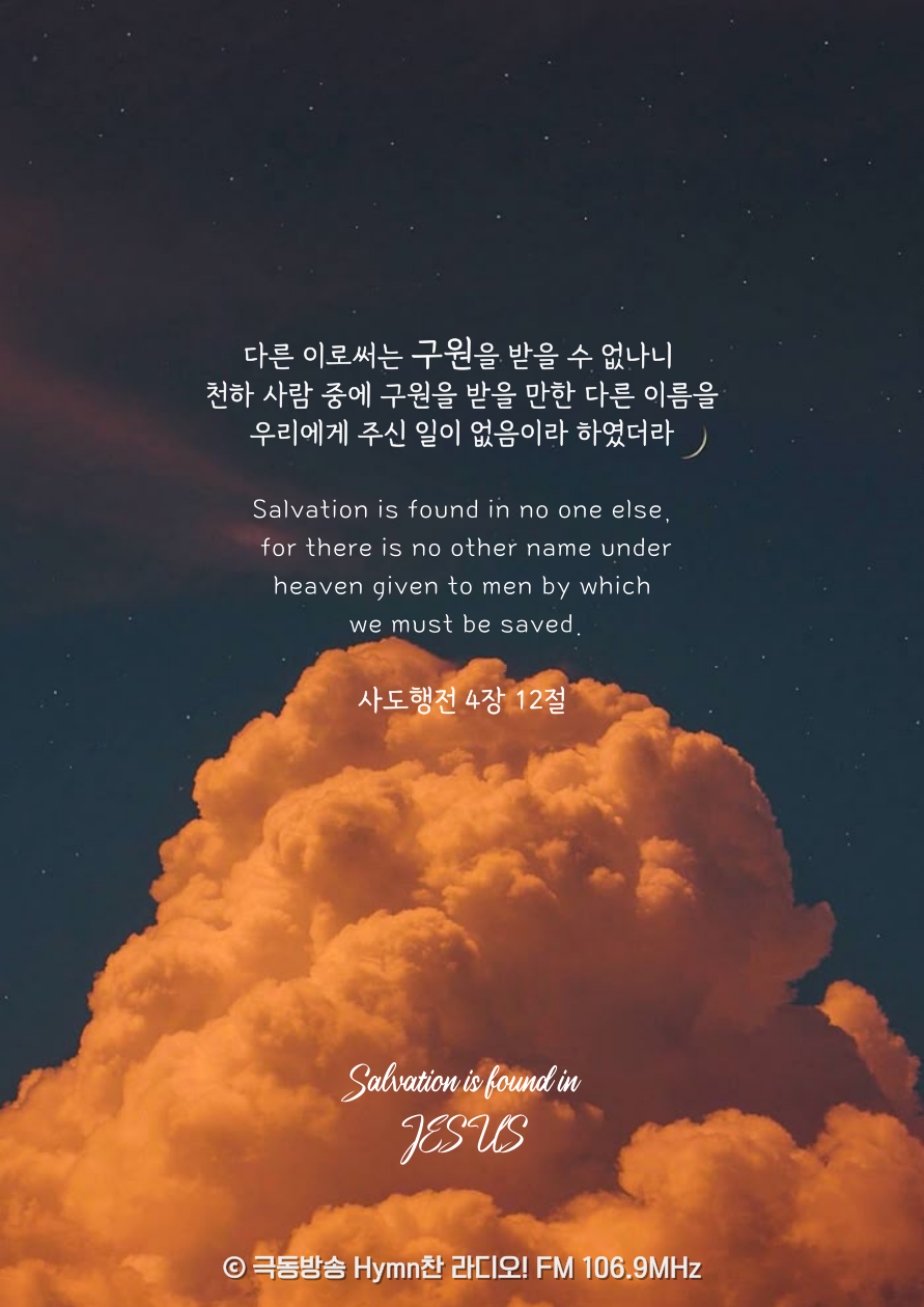 다른 이로써는 구원을 받을 수 없나니 천하 사람 중에 구원을 받을 만한 다른 이름을 우리에게 주신 일이 없음이라 하였더라