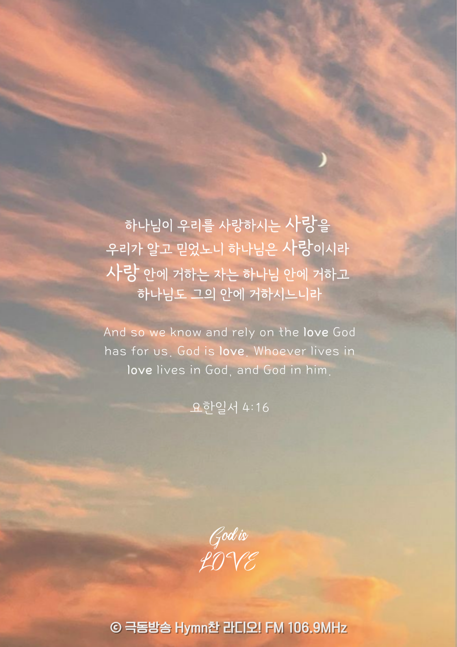 요한일서 4장 16절 말씀인데요, 문득 이 말씀 안에 love. 사랑이라는 단어가 몇 번 나올까? 궁금해져서 세어 봤어요. 21절의 짧은 이 말씀 안에 사랑이라는 말이 무려 스물 일곱 번 나오더라고요. 사도 요한은 하나님이 저와 여러분을 얼마나 사랑하시는지, 아들을 십자가에서 죽게 할 만큼 사랑하신 그 사랑을 꼭 알려 주고 싶지 않았을까요?